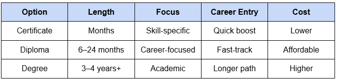 If your goal is to build job-ready skills and start working quickly, a diploma is the best balance of time, cost, and career outcomes.